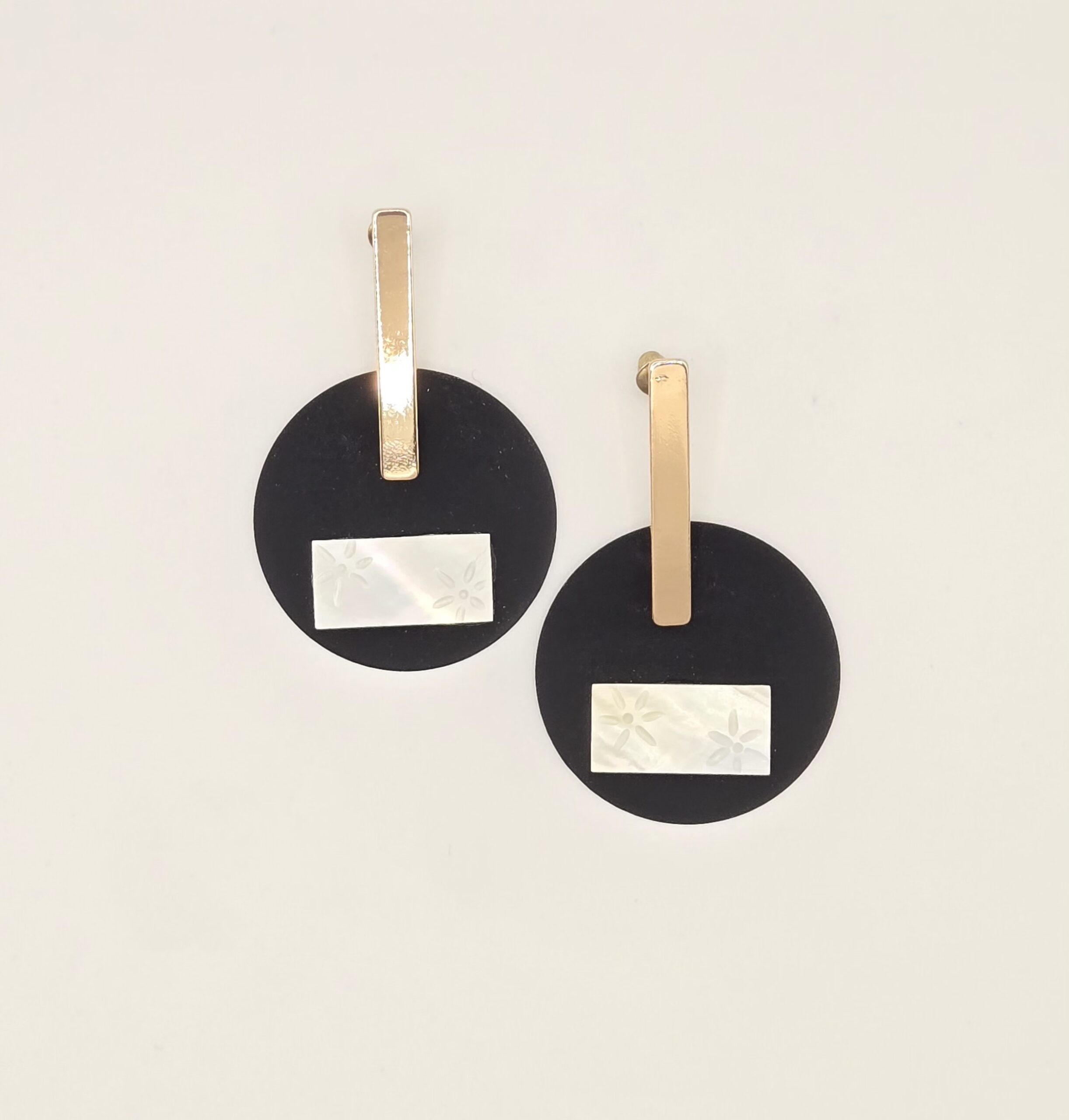 These handmade statement earrings feature a bold black circular base, accented with a shimmering mother-of-pearl inlay that adds a delicate floral detail. A sleek gold-tone bar elegantly suspends the design, creating a modern yet timeless look.