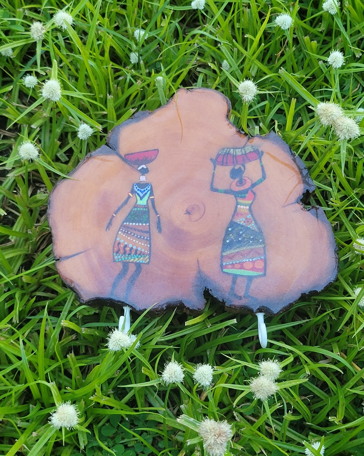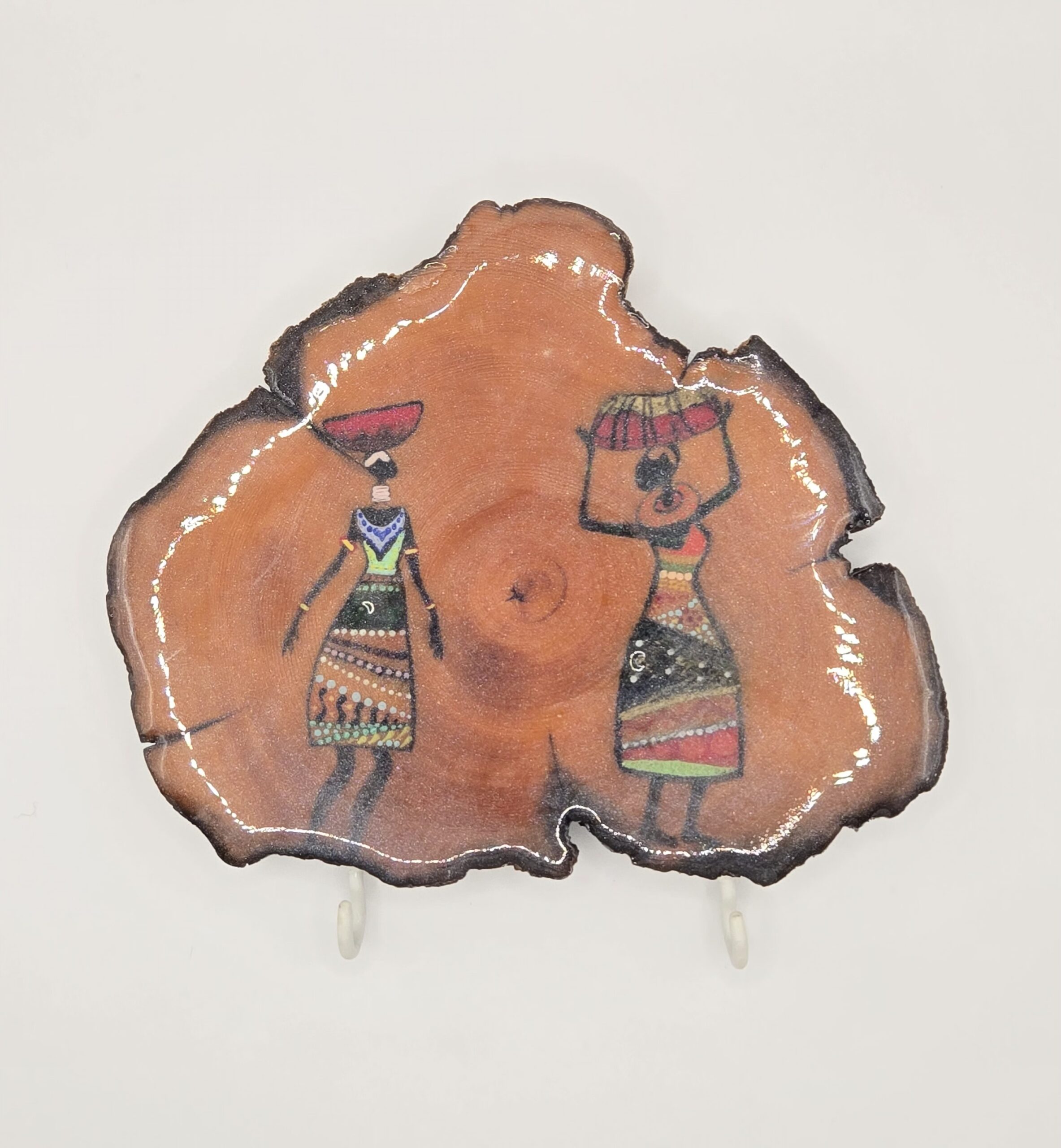 This stunning handcrafted artwork showcases a tribal-inspired painting on a natural wood slice, bringing together traditional artistry and organic beauty. The figures, adorned in colorful patterns, reflect cultural heritage and daily life, creating a captivating and meaningful composition. The natural edges of the wood preserve its rustic charm, while the resin finish adds durability and a sleek, polished look.