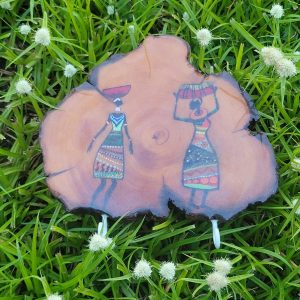 Echoes of Tradition – Tasmanian Wood Art” is a remarkable handmade artwork that celebrates cultural heritage and the beauty of nature. Created on a slice of Tasmanian wood, this piece features an intricate hand-painted depiction of two women in traditional tribal attire, carrying baskets—symbolizing strength, resilience, and the richness of everyday life in indigenous cultures.