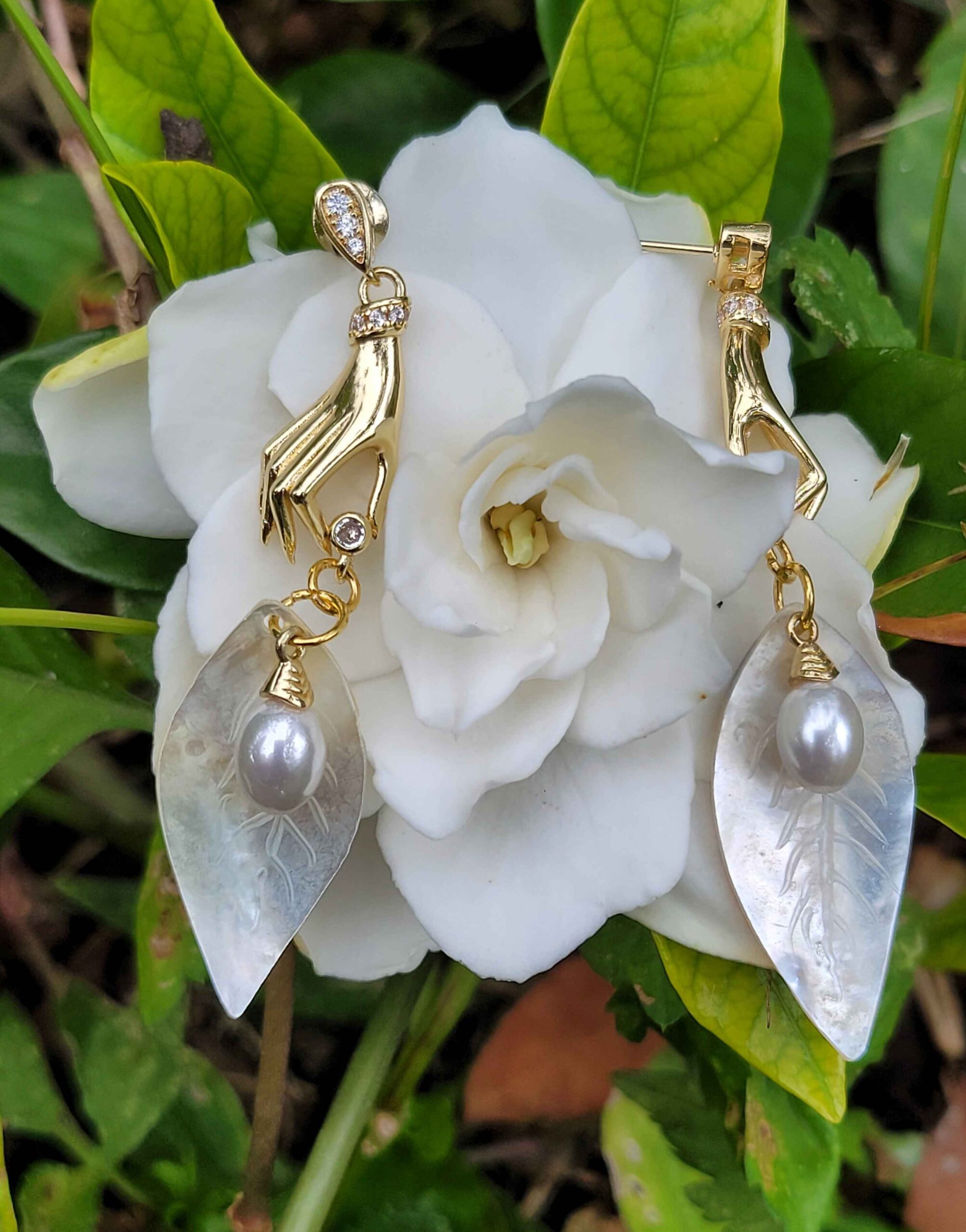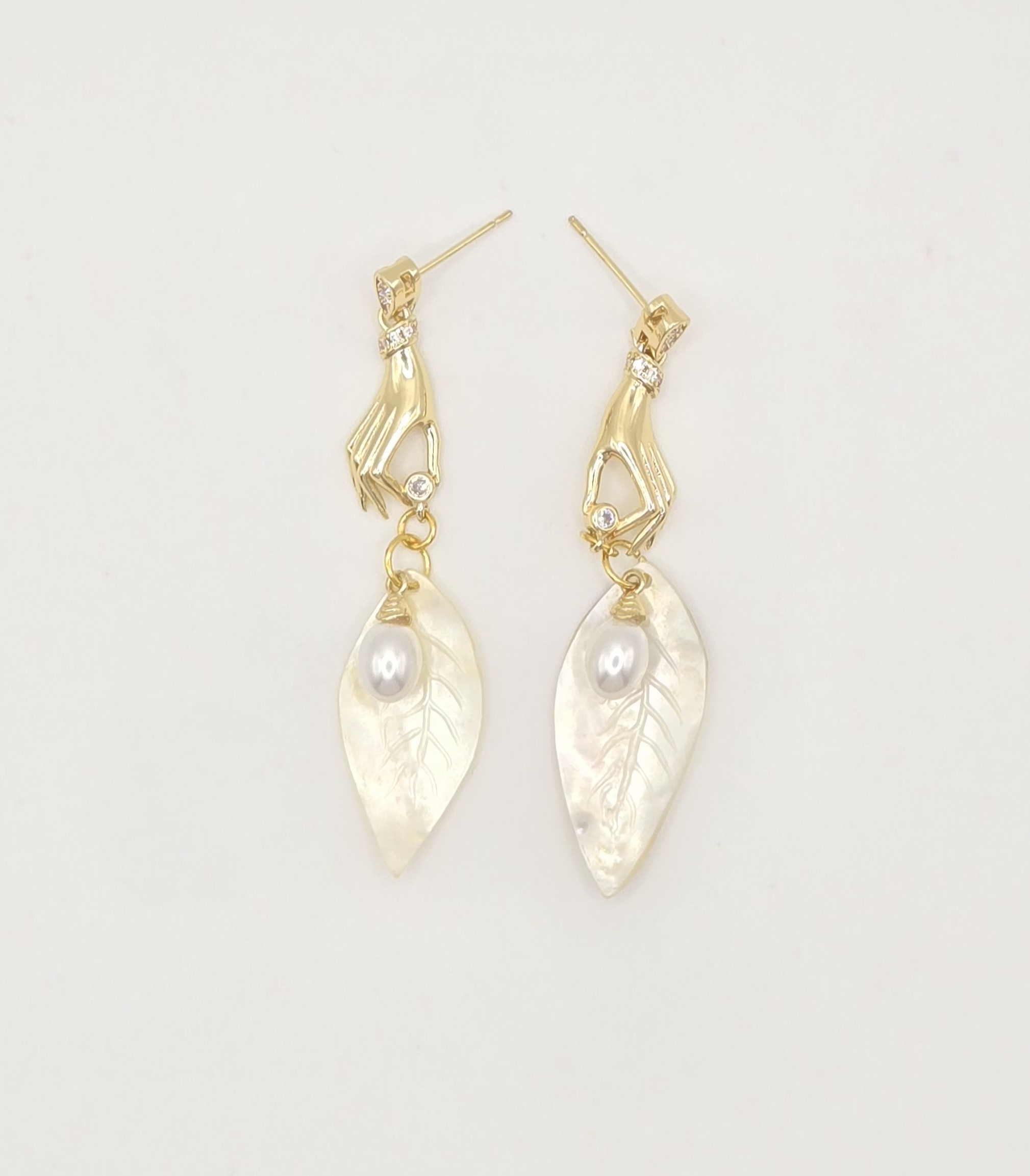These exquisite earrings feature a graceful golden hand design, delicately holding a hand-carved natural shell. Each shell is intricately shaped into a leaf-like form using traditional tools, showcasing detailed engravings of natural veins. The design is enhanced by a luminous freshwater pearl set at the center, symbolizing elegance and purity.