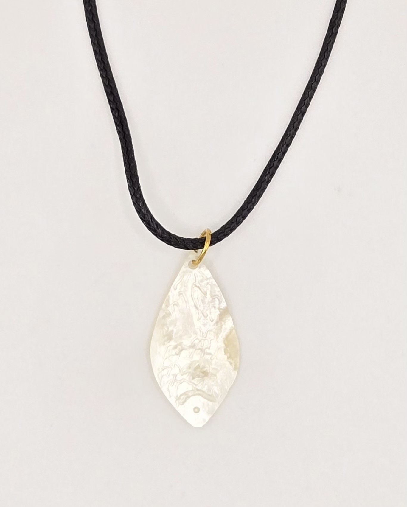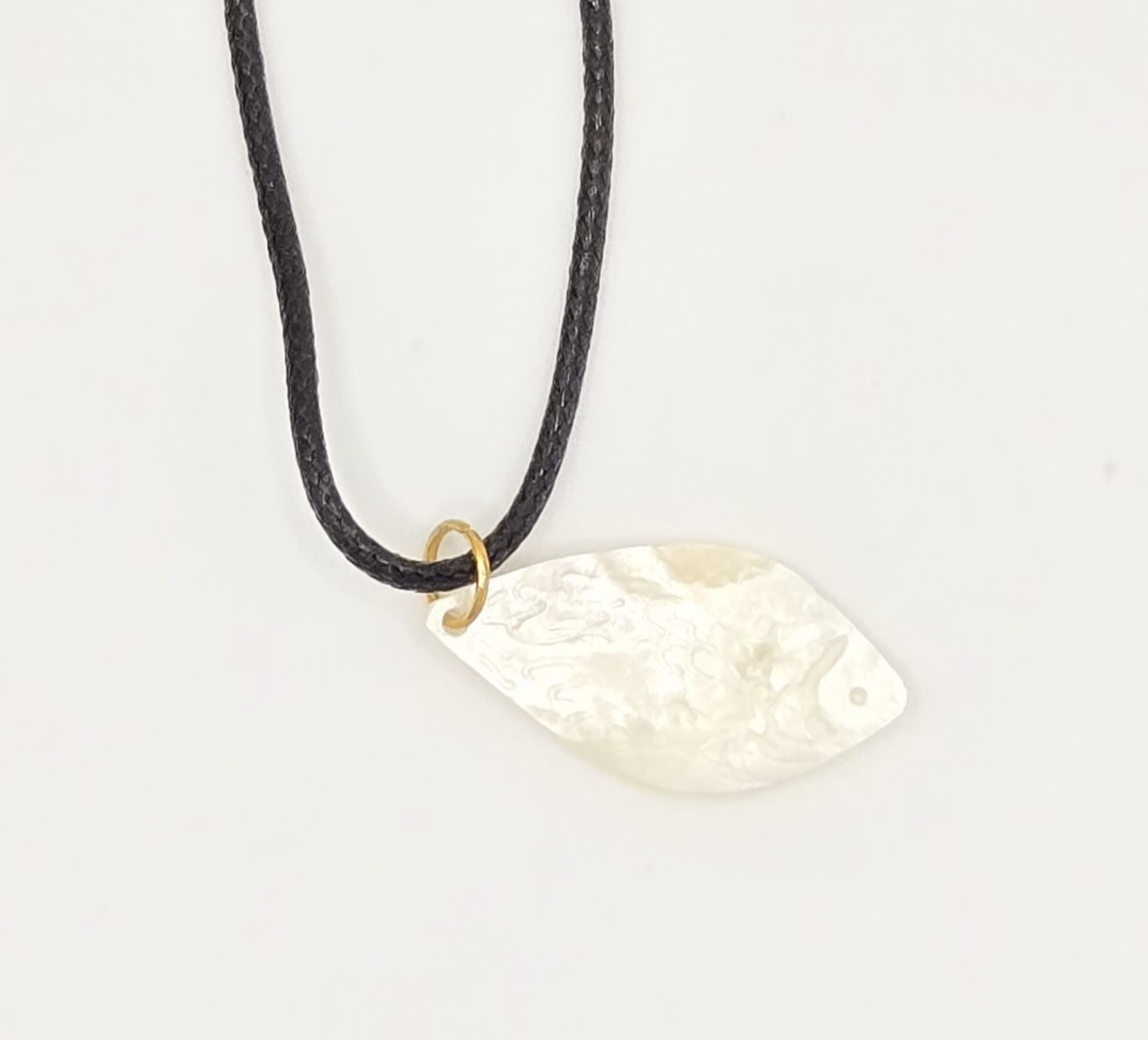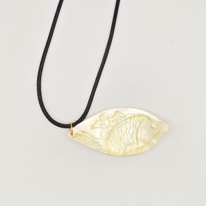 This elegant pendant necklace is a unique piece of wearable art, meticulously crafted by hand. The pendant is made from natural shell, showcasing its iridescent beauty and intricate carvings inspired by golden fish. The delicate patterns are engraved using specialized tools, highlighting the artisanal craftsmanship and connection to organic forms.