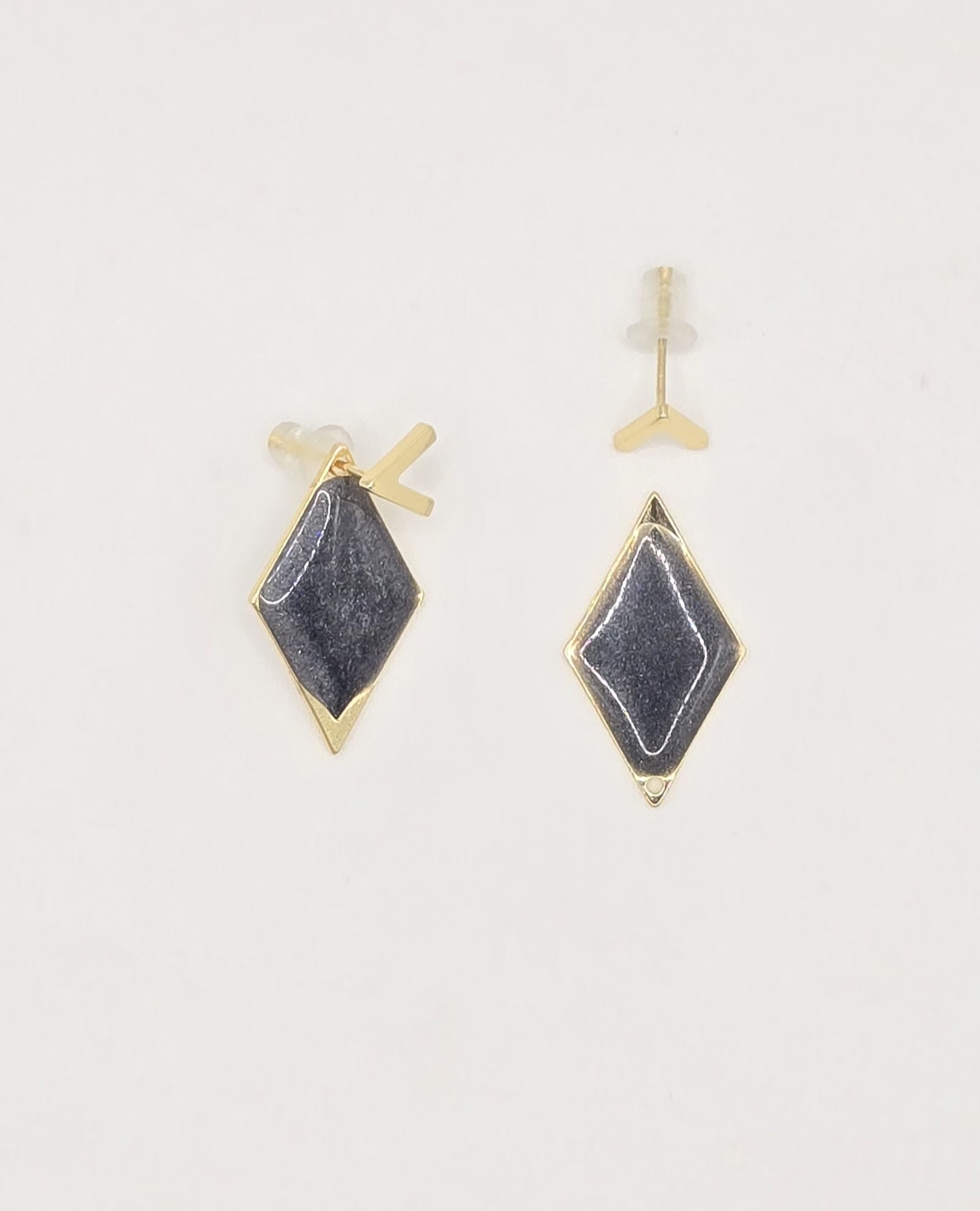 These versatile handmade earrings feature a sleek black resin design accented with gold details for a modern, elegant look. The unique two-piece construction allows you to wear them in two ways—keep it minimal with the gold diamond-shaped studs or attach the black drop pieces for a bold statement.