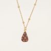 This elegant necklace features a hand-carved mother-of-pearl pendant with delicate engraved patterns, showcasing its natural iridescence. The pendant’s unique curved shape adds a modern touch, while the gold-tone chain with decorative accents enhances its sophisticated look. Perfect for those who appreciate nature-inspired, artisanal jewelry.