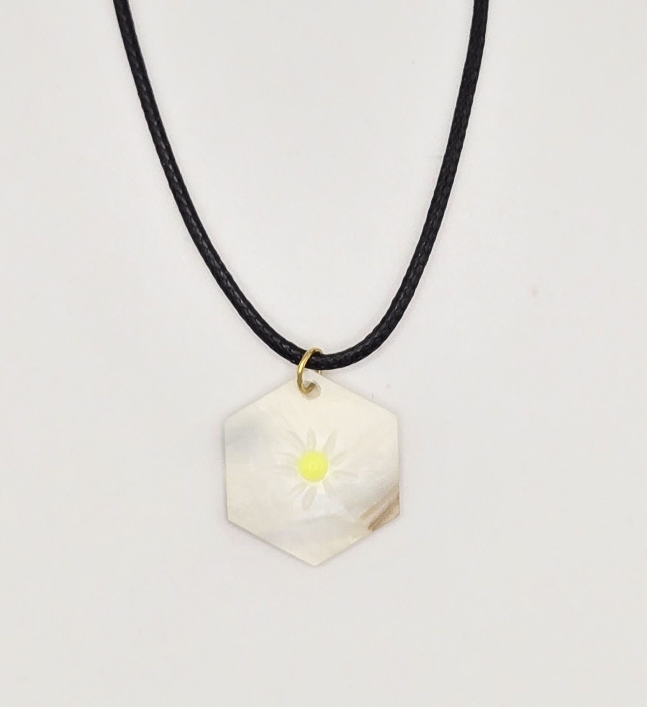 “This unique, handmade necklace is crafted with intricate care and attention to detail. Made from natural shell, each piece is delicately carved using special tools to create a stunning hexagon shape. Drawing inspiration from the beauty of nature, this necklace embodies both craftsmanship and the organic patterns found in the world around us. Each piece is one-of-a-kind, making it a perfect addition to any collection.”