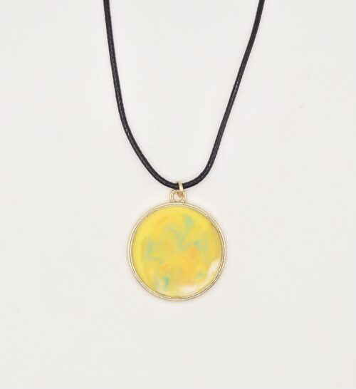 This exquisite handmade necklace features a circle resin pendant embedded, creating a timeless and elegant design. The pendant shimmers with a subtle glitter finish, enhancing its beauty and uniqueness. Its glossy pendant sits on an adjustable black cord, creating a simple and elegant look. Perfect for everyday wear or as a special gift.