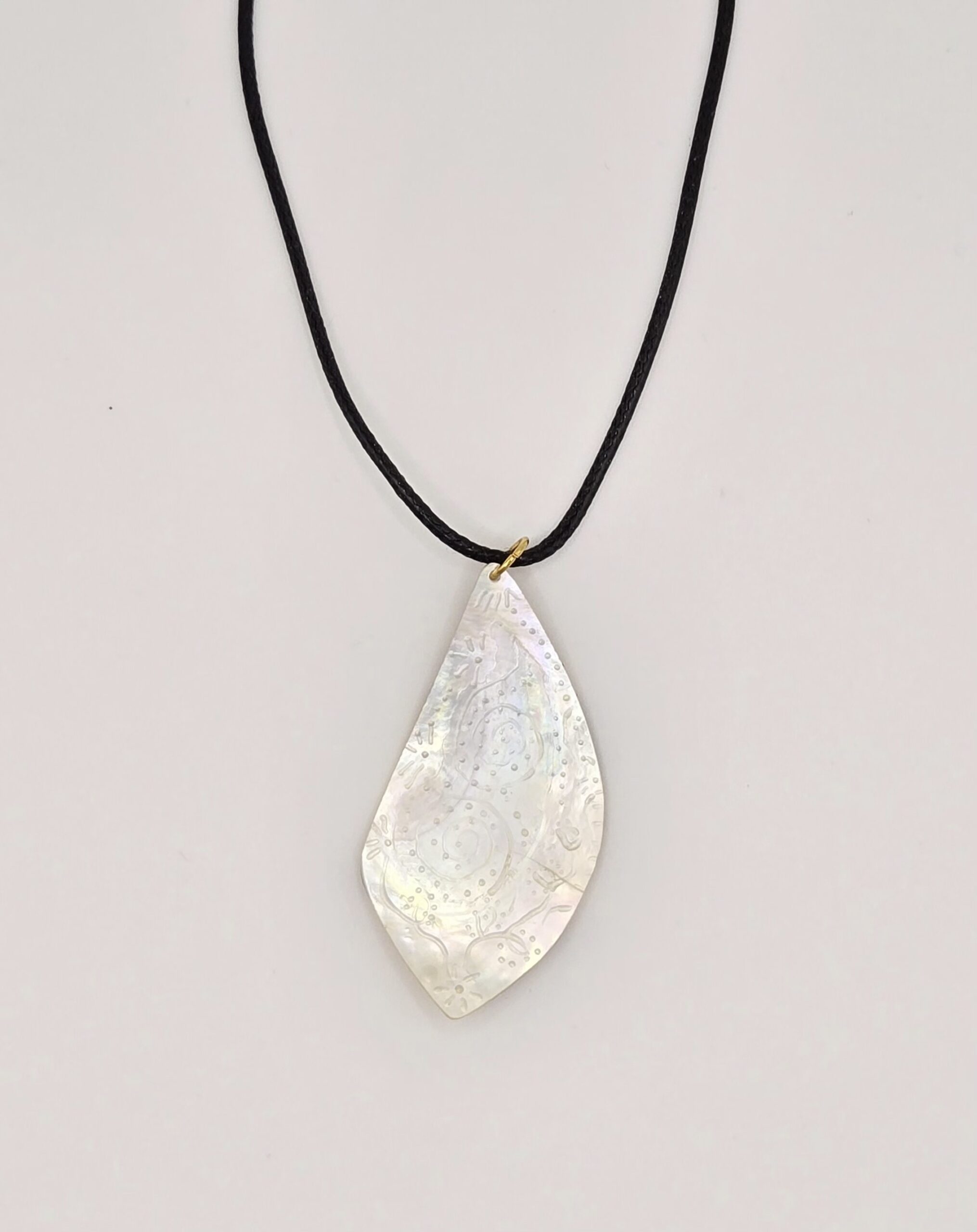The shimmering surface of the shell is adorned with an intricate floral pattern, adding a touch of sophistication and charm. Suspended from a durable black cord and accented with a golden ring, this necklace is lightweight and comfortable to wear, making it perfect for any occasion.