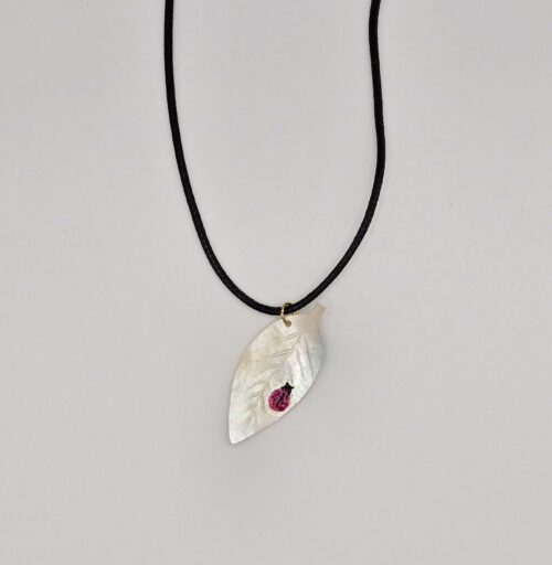This exquisite necklace is a unique piece of craftsmanship, featuring a hand-carved shell pendant shaped like a delicate leaf. The pendant is adorned with a beautifully painted ladybug, symbolizing luck and harmony with nature. The iridescent sheen of the natural shell enhances its elegance, while the intricate carvings highlight the artisan’s skill and attention to detail.