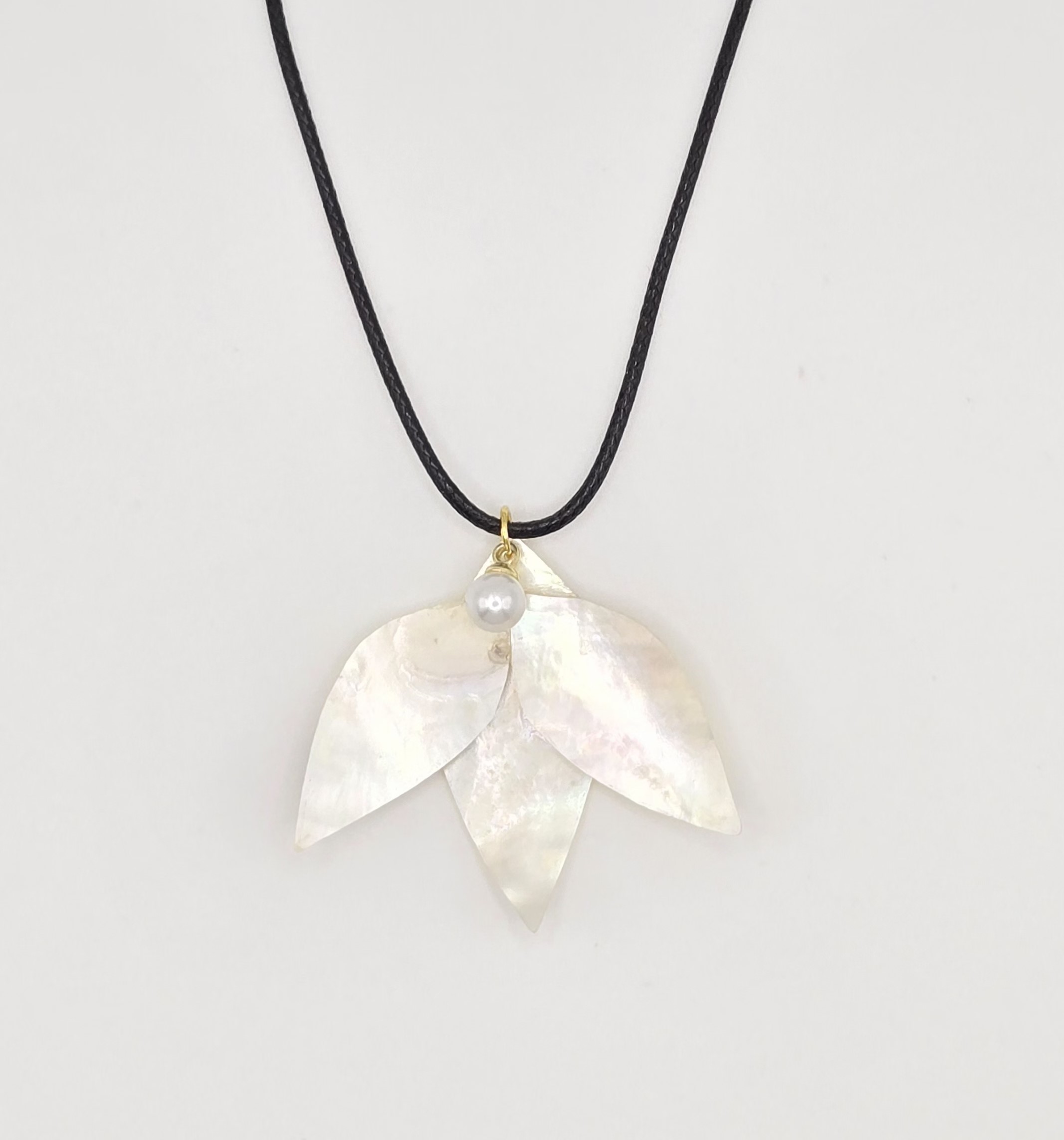 This elegant pendant necklace is a unique piece of wearable art, meticulously crafted by hand. The pendant is made from natural shell, showcasing its iridescent beauty and intricate carvings inspired by nature. The delicate patterns are engraved using specialized tools, highlighting the artisanal craftsmanship and connection to organic forms.