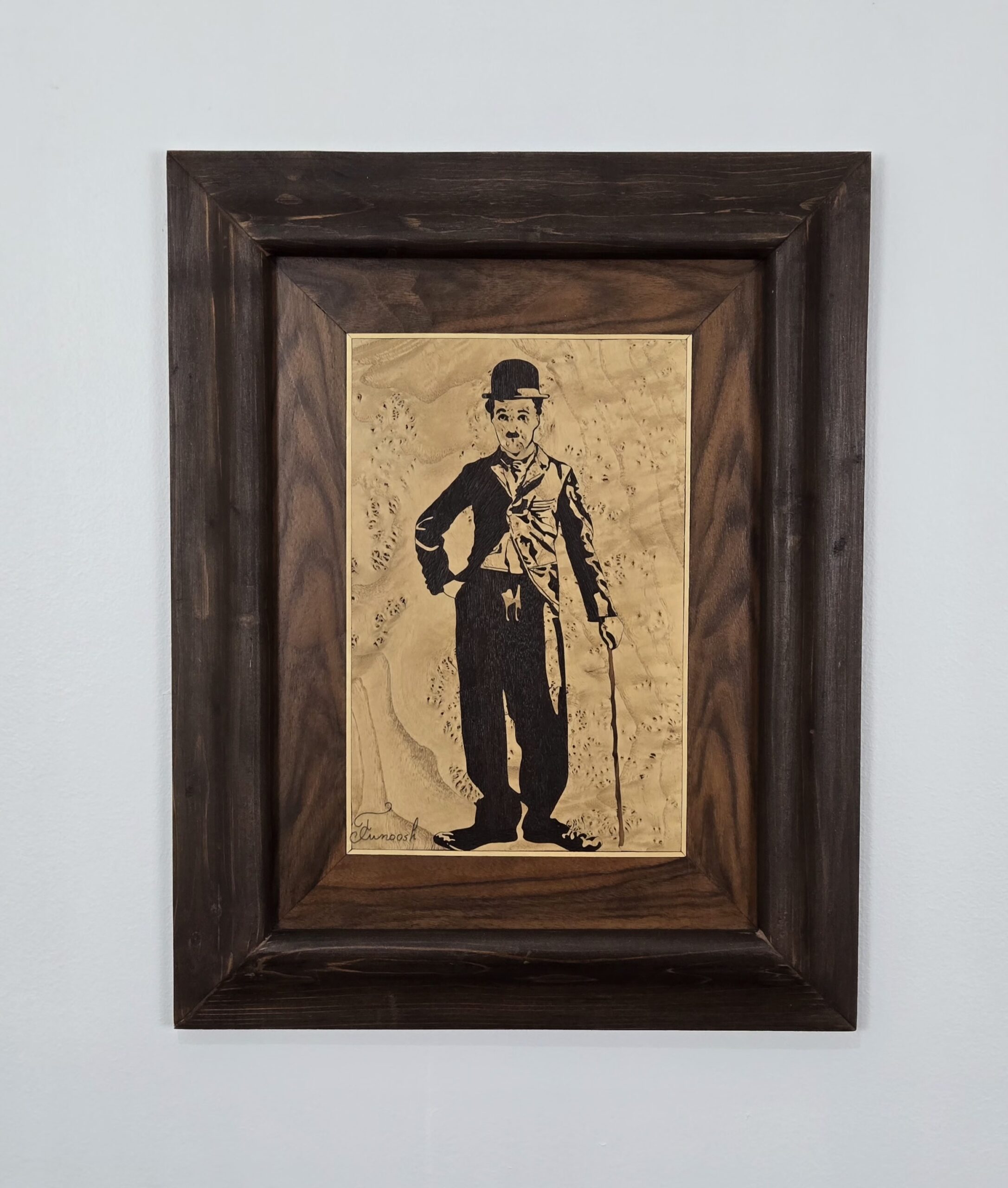 Step into the golden age of cinema with “Timeless Laughter,” a remarkable handmade marquetry artwork crafted entirely from solid natural wood and timber—without the use of veneers. Every detail in this piece is formed by carefully selecting, cutting, and fitting different wood types together, using their natural tones and textures to depict the beloved Charlie Chaplin.